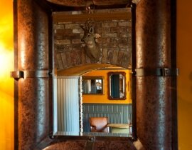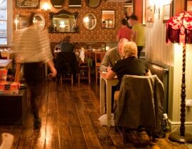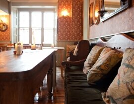 A warm feeling area with little pockets of seating of various sizes. Highly polished reclaimed wooden floors, beaten up rugs, large cushioned leather benches and beautiful antique standard lamps.