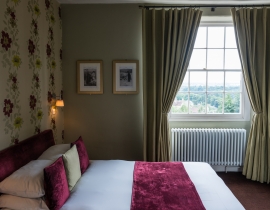 This room is decorated with fresh yet subtle greens and warming reds. With two windows, one over looking pub garden and the other looking out across with views as far as the Westbury White Horse.